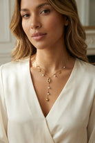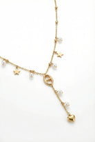 Ses étoiles dorées, délicatement suspendues le long de la chaîne, s'accordent à de perles lumineuses pour créer un bijou d'une finesse absolue. Son pendentif tombant, fluide et aérien, accompagne naturellement les mouvements et capte la lumière avec subtilité.